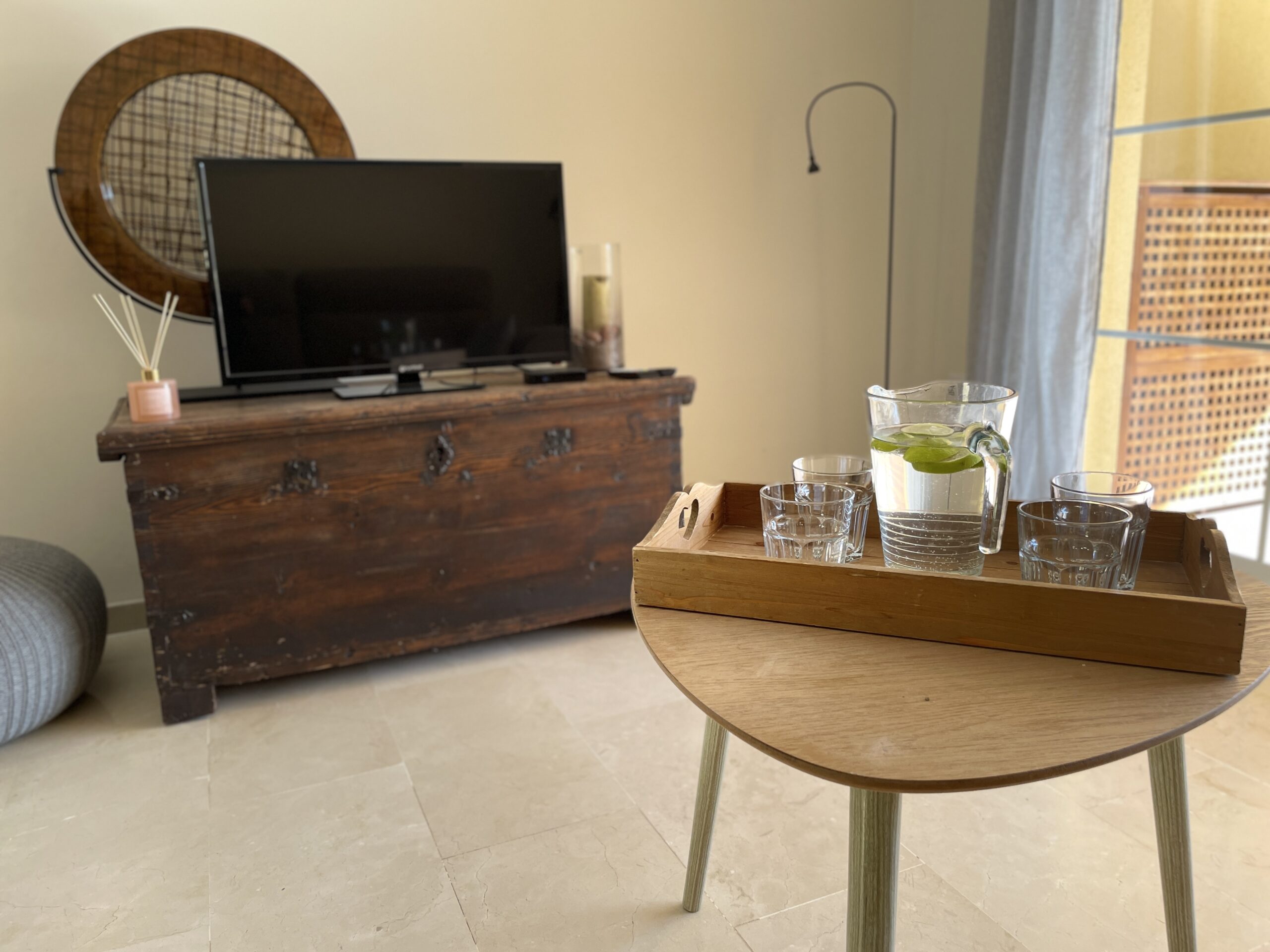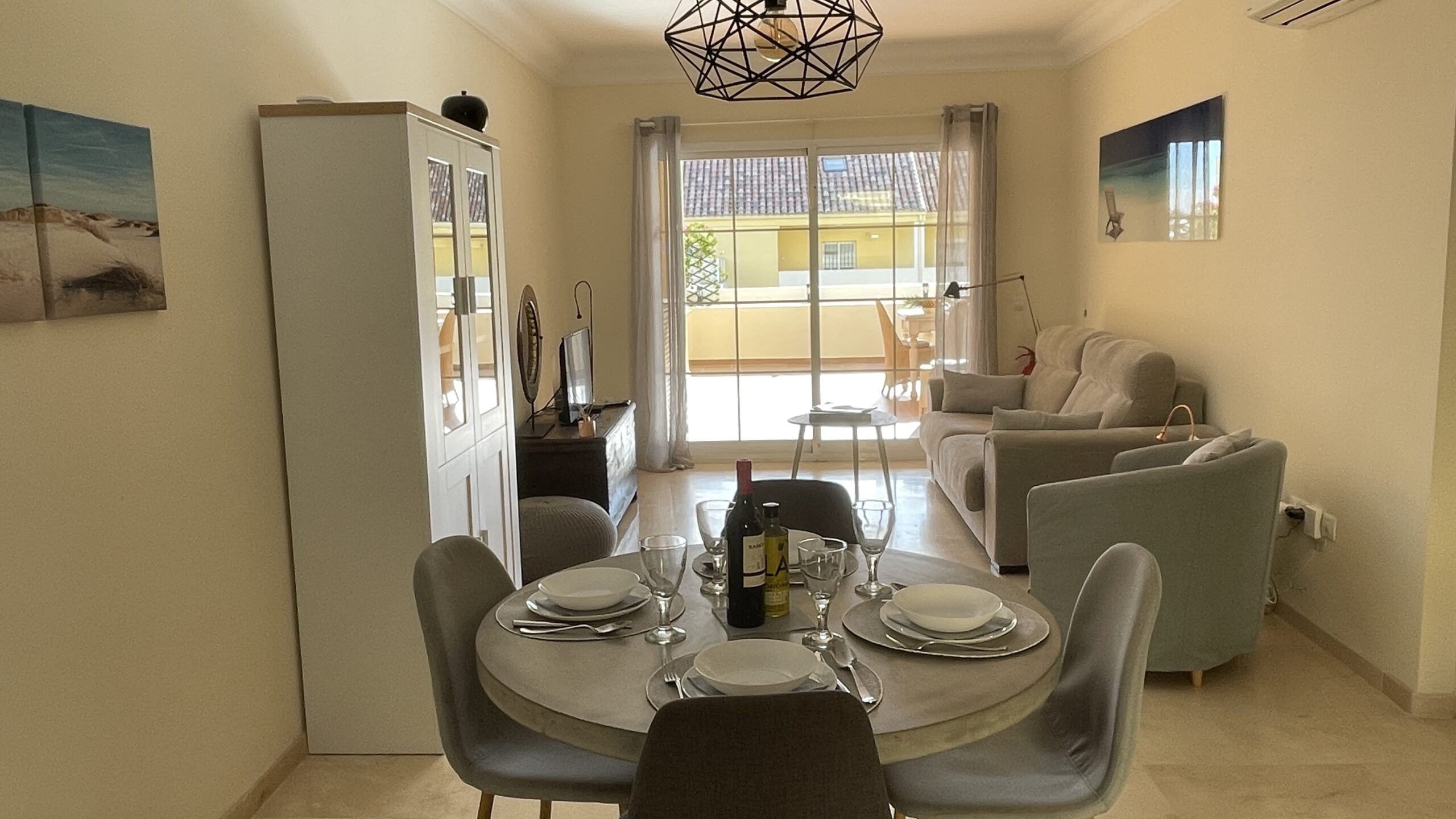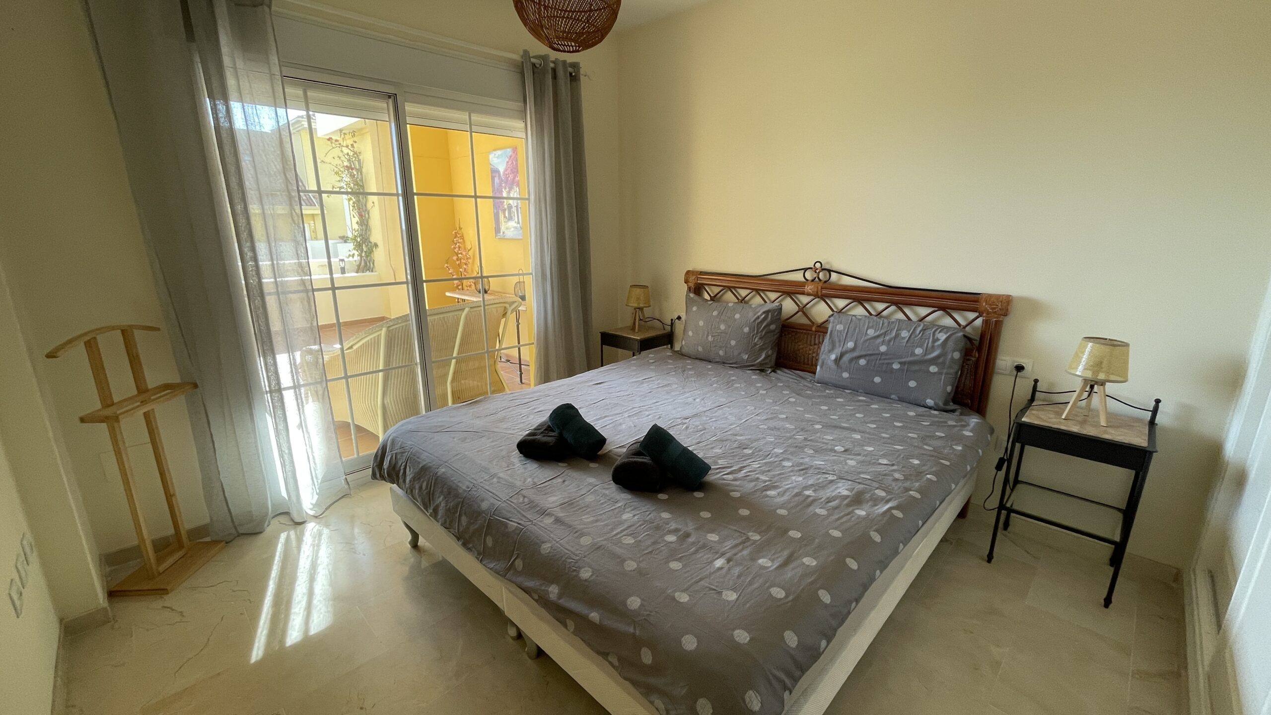 Moderno apartamento con 2 habitaciones dobles y dos baños (uno en suite), comedor para 4 personas, aire acondicionado y cocina totalmente equipada. Amplia terraza con comedor para 4 personas y zona de estar con sofá. WIFI incluido en el precio. Urbanización cerrada con dos piscinas, jardines y acceso para personas con movilidad reducida. Las piscinas cuentan con socorristas durante el verano. Aparcamiento gratuito justo enfrente del apartamento.