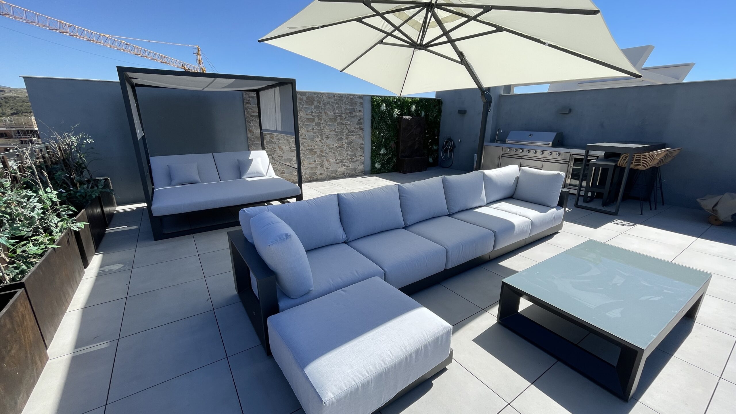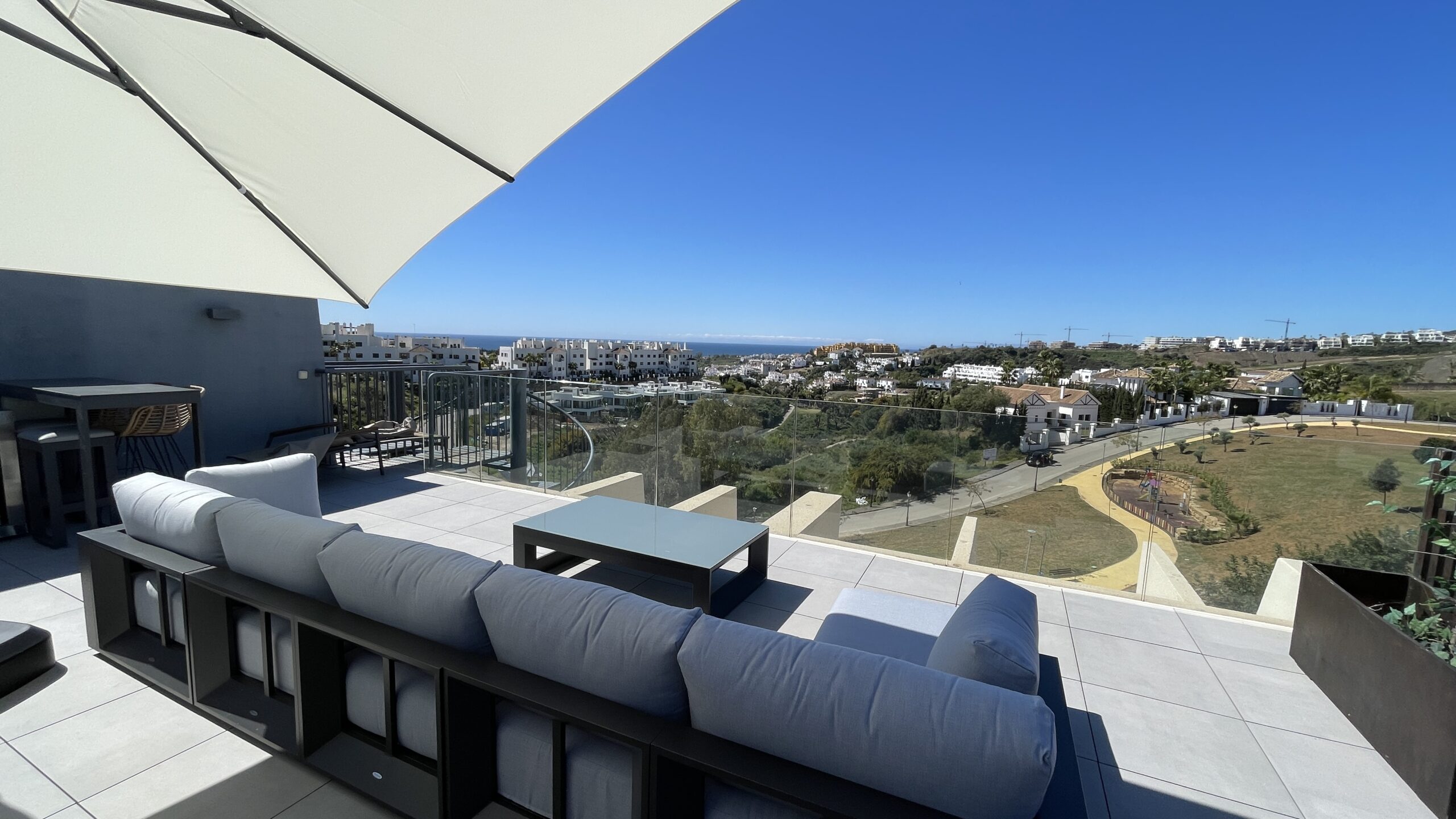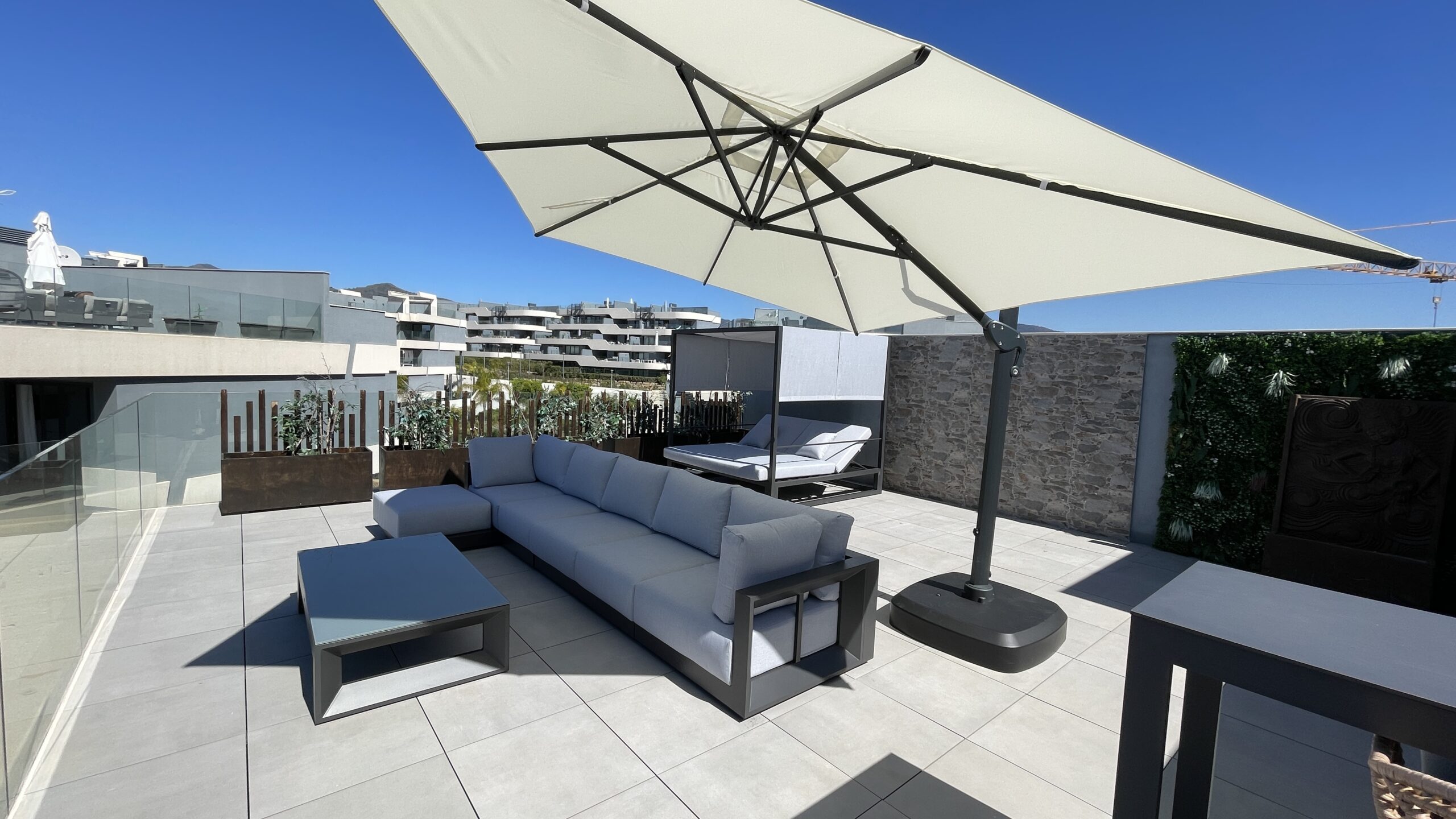 This elegant duplex penthouse with 2 bedrooms, 2 bathrooms is located in Estepona and offers panoramic views of the sea, the mountains and nature. The outstanding features are both terraces, but above all the large private sun terrace of almost 70 sqm. The penthouse has an unbeatable location within the residential complex, as it is a south-west facing corner apartment. Fully equipped kitchen with high-quality electrical appliances, individually adjustable air conditioning, extra-long awnings with wind sensors, generous built-in wardrobes with great interior fittings, high-quality ceiling fans and internet connection inside and outside. Garage space for 1 car included. The gated community of Oasis 325 is exceptional: 24-hour security and concierge, outdoor and indoor pool, spa area with sauna and Turkish bath, fully equipped gym and yoga area, spacious changing rooms, large communal area (co-working room). The famous harbour "Puerto Banus" with its luxury shops, restaurants, yachts and nightlife can be reached in 15 minutes by car and the international airport of Malaga is less than an hour away. Several golf courses, hospitals, schools and shopping centres are within easy driving distance. To your comfort, it is recommended to book the apartment one more night for early arrivals or late departures. Airport transfers available, please, ask for rates.